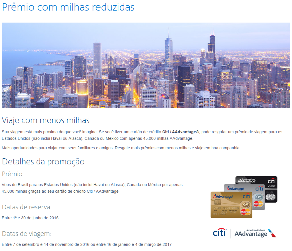 A American acaba de anunciar a sua promoção sazonal em conjunto com os cartões Citibank AAdvantage. Entre os períodos de 7 de Setembro e 14 de Novembro de 2016, e 16 de Janeiro e 4 de Março de 2017 será possível emitir passagens para os EUA por 45 mil milhas ida e volta, o que é um excelente negócio, já que o resgate de 40 mil milhas acabou devido a alteração na tabela do programa em Abril deste ano. Atualmente o valor mínimo para fazer uma viagem de ida e volta para os EUA em classe econômica é de 60 mil milhas, logo, os clientes dos cartões citi receberão um desconto de 15 mil milhas. A promoção vale para reservas realizadas até o dia 31 de Julho de 2016.