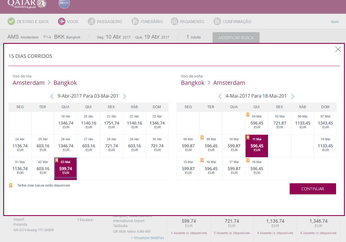 Essa tarifa faz parte da promoção Festival Travel da Qatar Airways, e é uma excelente tarifa de 1.200 Euros, que ao valor real de hoje fica aproximadamente em 4 mil reais, mas caso você pague com visa ainda terá 15% de desconto jogando o valor final da compra para aproximadamente 3.400 Reais, muito barato para classe executiva entre Amsterdã e Bangkok. Tudo bem que ainda é necessário a conexão com Amsterdã, o que não é difícil de encontrar por dois motivos, primeiro que os valores estão baixos, em média 2 mil reais em classe econômica, ou você pode utilizar milhas Smiles para voar de Air France ou KLM, ou ainda milhas multiplus para ir de LATAM, British ou Iberia.